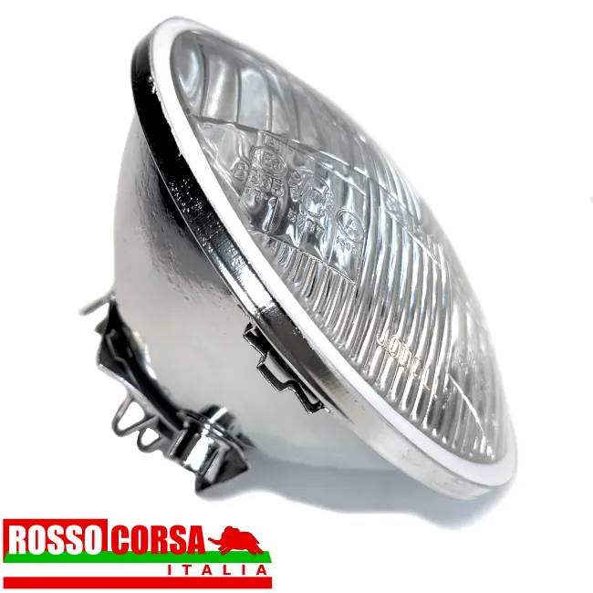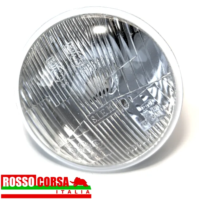 Gruppo ottico anteriore laterale per Lancia Fulvia Coupè 2°serie. Originale Siem con lampadina H1, luce di posizione e schermo interno sostenuto da tre aste. Restaurato e riportato al nuovo tramite un trattamento di metalizzazione della parabola che consente di raggiungere un coefficente di riflettenza pari quasi al massimo teorico. Sul vetro sono impresse le seguenti diciture: – laterare sinistra (A E3 8935 T 8 4 / Siem 5797 / A 15934) – centrale in basso (Jodo Lux) – centrale in alto (HC E2 64 / HC E2 61) – laterale destra (HC / IGM 4871 / IGM 5042 LAX)
