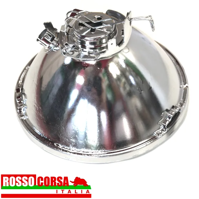 Gruppo ottico anteriore laterale per Lancia Fulvia Coupè 2°serie. Originale Siem con lampadina H1, luce di posizione e schermo interno sostenuto da tre aste. Restaurato e riportato al nuovo tramite un trattamento di metalizzazione della parabola che consente di raggiungere un coefficente di riflettenza pari quasi al massimo teorico.